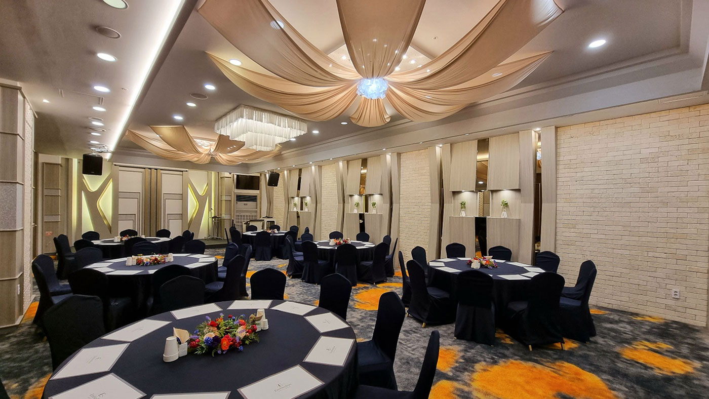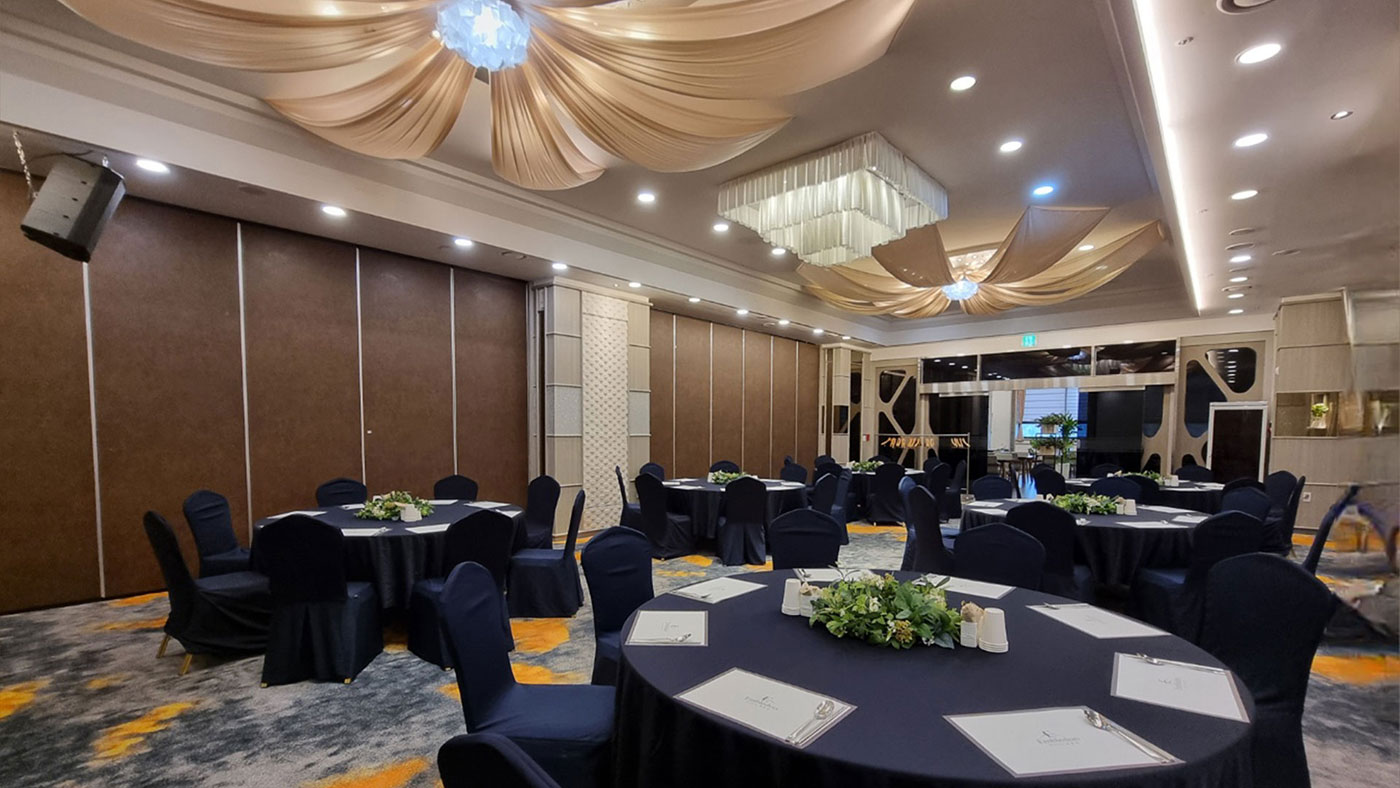 Syaina Hall 샤이나홀 심플하고 우아한 분위기 속에서 행사의 성격에 따라 다양한 규모로 이용 가능합니다. 샤이나홀 Syaina Hall 연회 예약문의 Special Feature 심플하고 우아한 분위기의 샤이나홀은 친목 모임, 가족 모임, 소규모 비즈니스 미팅 및프라이빗한 모임에 최적의 환경을 갖추고 있습니다. 오랜 시간 축적된 호텔의 전문적인 서비스 경험을 토대로 성공적인 행사를 연출하실 수 있습니다. Floor5F Scale200석