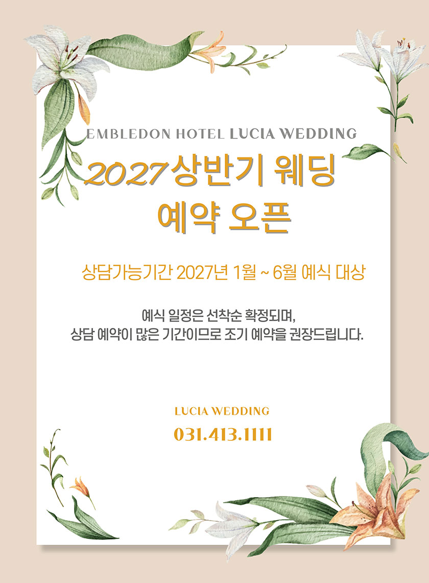 이벤트 상세 혜택 2027년 상반기 웨딩 상담 예약 오픈 엠블던호텔 루시아웨딩의 2027년 상반기 웨딩 상담 예약이 오픈되었습니다. 이벤트 기간 : 2026/01/13 ~ 계속 TEL : 031-413-1111 이벤트 혜택 [2027 상반기 웨딩 상담 오픈 안내]엠블던호텔 루시아웨딩의2027년 상반기 웨딩 상담 예약이 오픈되었습니다.새로운 시즌의 아름다운 웨딩을 준비하시는 예비 신랑·신부님께맞춤 상담과 견적 안내를 도와드립니다.★ 상담 가능 기간2027년 1월 ~ 6월 예식 대상★ 상담 안내사전 예약제 운영상담 내용 : 예식장 투어, 메뉴 안내, 견적 상담, 일정 확인 등★ 예약 : 031-413-1111★ 예식 일정은 선착순 확정되며,상담 예약이 많은 기간이므로 조기 예약을 권장드립니다.엠블던호텔은예식의 품격과 감동을 함께하는 웨딩을 준비합니다.예비 고객님의 많은 관심과 문의 부탁드립니다.감사합니다. 이벤트 기간 2026/01/13 ~ 계속 목록 이전 이벤트 이전 이벤트가 없습니다. 다음 이벤트 루시아웨딩 계약 후기 이벤트